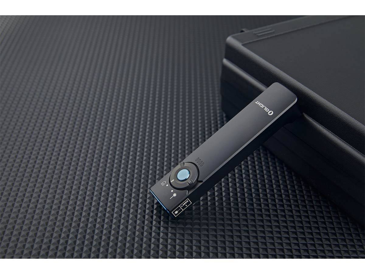 The Arkfeld is the first dual light source and portable EDC Flashlight at Olight. 2 color temperatures, 5 brightness levels as well as a memory function that allow you to select what you like with one single click. An amazing max 1,000lumens output is able to light up every corner you can see. The green laser, a good helper when making a presentation or amusing your pets, is featured in the flashlight as well. The creative switch design (Central Button & Selector) is both practical and beautiful. Besides, the magnetic charging cable enables you to have it charged automatically. Last but not least, the flashlight is flat and features a clip, so it is easy to carry (3.07oz in weight and 0.59in in thickness)—It can be clamped onto your pockets and shirts even without noticing its existence. With great design plus multiple lighting functions, Arkfeld can be a second-to-none choice for EDC flashlight.